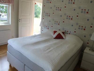 Ett sovrum med kontinentalsäng (160x200cm), garderob, byrå samt 2 sängbord. Bäddsoffa (bäddmått 140 cm) finns i allrummet. I allrummet finns även TV med basutbud och hemmabiosystem. Ni får tillgång till DVD-filmer och pocketböcker under er vistelse hos oss.