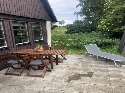 Uteplats med bord o stolar för 4, 1 solsäng och liten klotgrill.