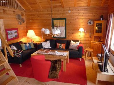 Trivsam timmerstuga i Gubbmyren med utsikt över Lindvallens och Sälfjälltorgets skidbackar.