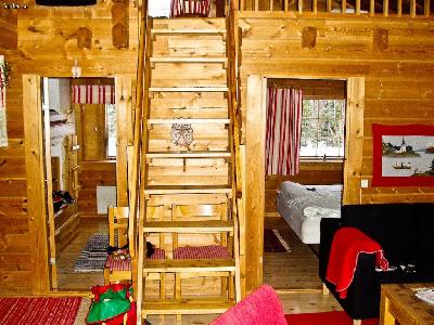Storstuga, kök, 2 sovrum, hall, badrum, bastu samt loft med 2 sängar och lekhörna.