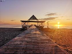 Ett stenkast från stugan fann vi den finkorniga och barnvänliga stranden, där det även fanns brygga, bangolf och pooler m.m.