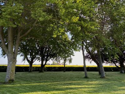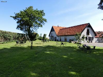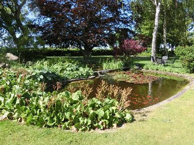 Det finns många sittgrupper att välja på i trädgården samt i den lilla parken. Damm med fiskar, vilken ej är inhägnad. Gung-/och klätterställning finns i trädgården.