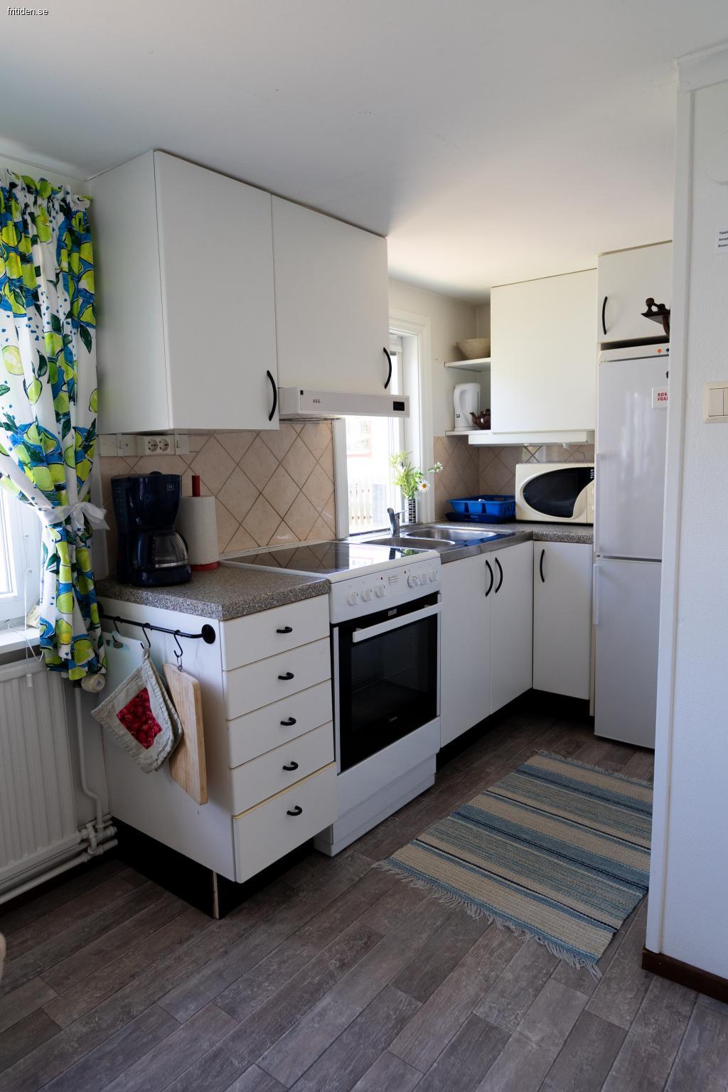 Gårdshuset består av ett välutrustat kök med matbord, ett rum med bäddsoffa för två samt våningssäng.