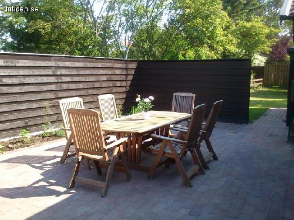 Stor barnvänlig och solig tomt om ca 800 kvm, terrass med infravärme, utemöbler och kolgrill. Parkering på tomten.