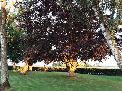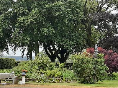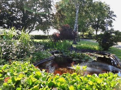 Det finns många sittgrupper att välja på i trädgården samt i den lilla parken. Damm med fiskar, vilken ej är inhägnad. Klotgrill. Gung/klätterställning finns i trädgården.