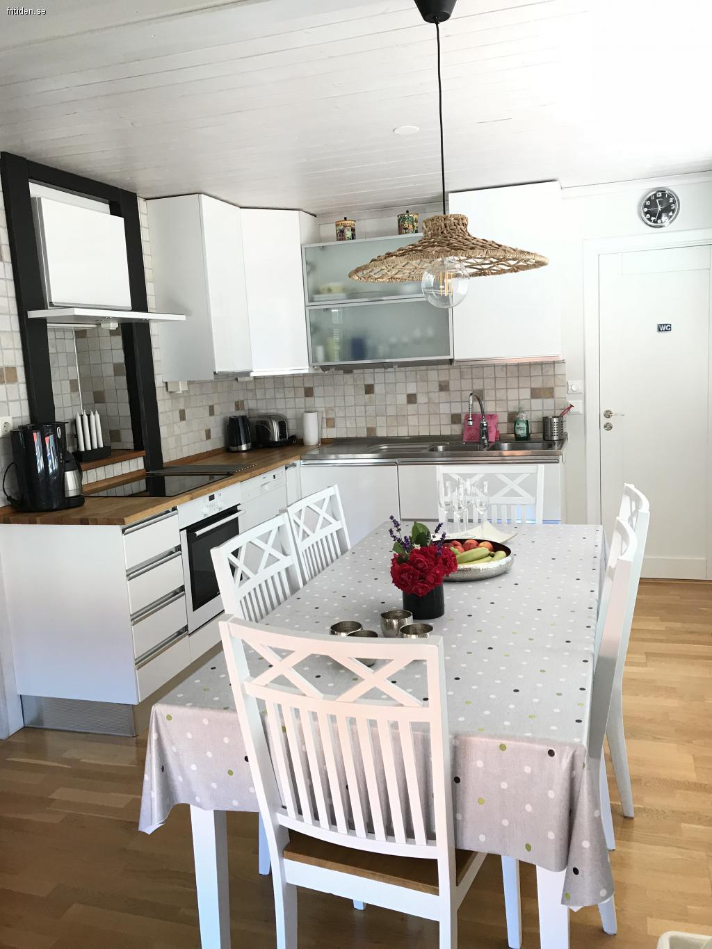 Köket är välutrustat med häll, ugn, fläkt, mikro, kyl, frys, diskmaskin m.m.