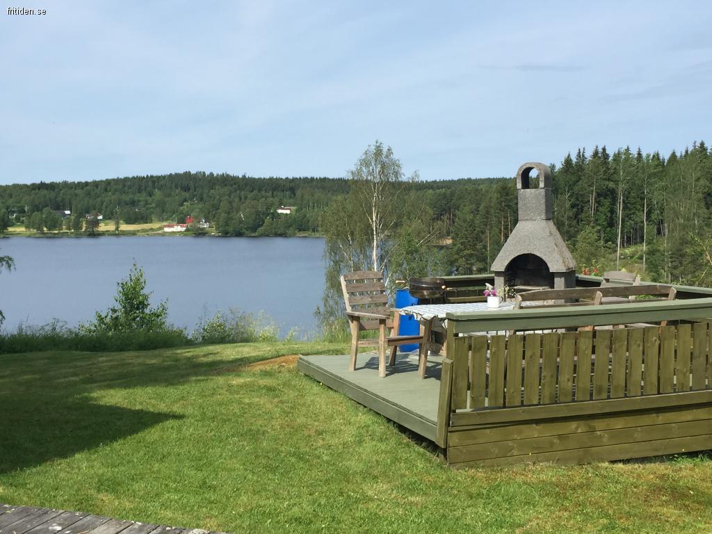En stor grillplats med stengrill på en vacker platå intill stugan med sjöutsikt. Extra sängplatser i nybyggd gillestugan intill med plats för övernattning.