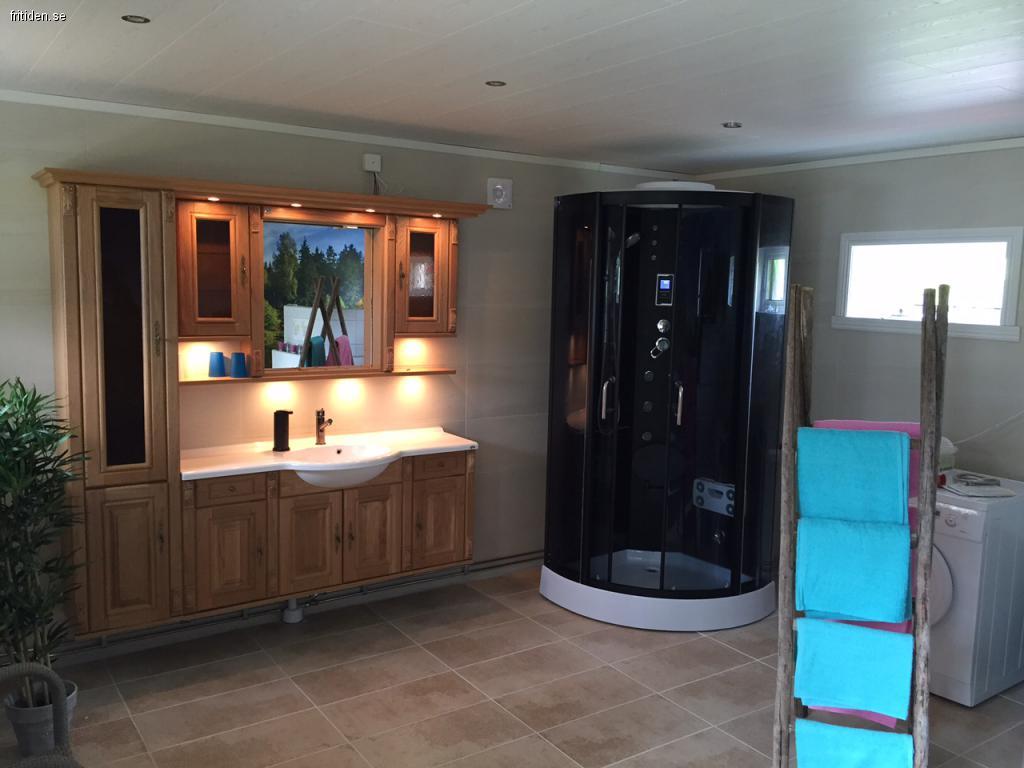 Stor bad/soldäck där man kan njuta vid varma sommardagar. Egen båt & brygga. Stor WC del med tvättmaskn, dusch, toalett. Allt med utsikt över sjön & solnedgång.