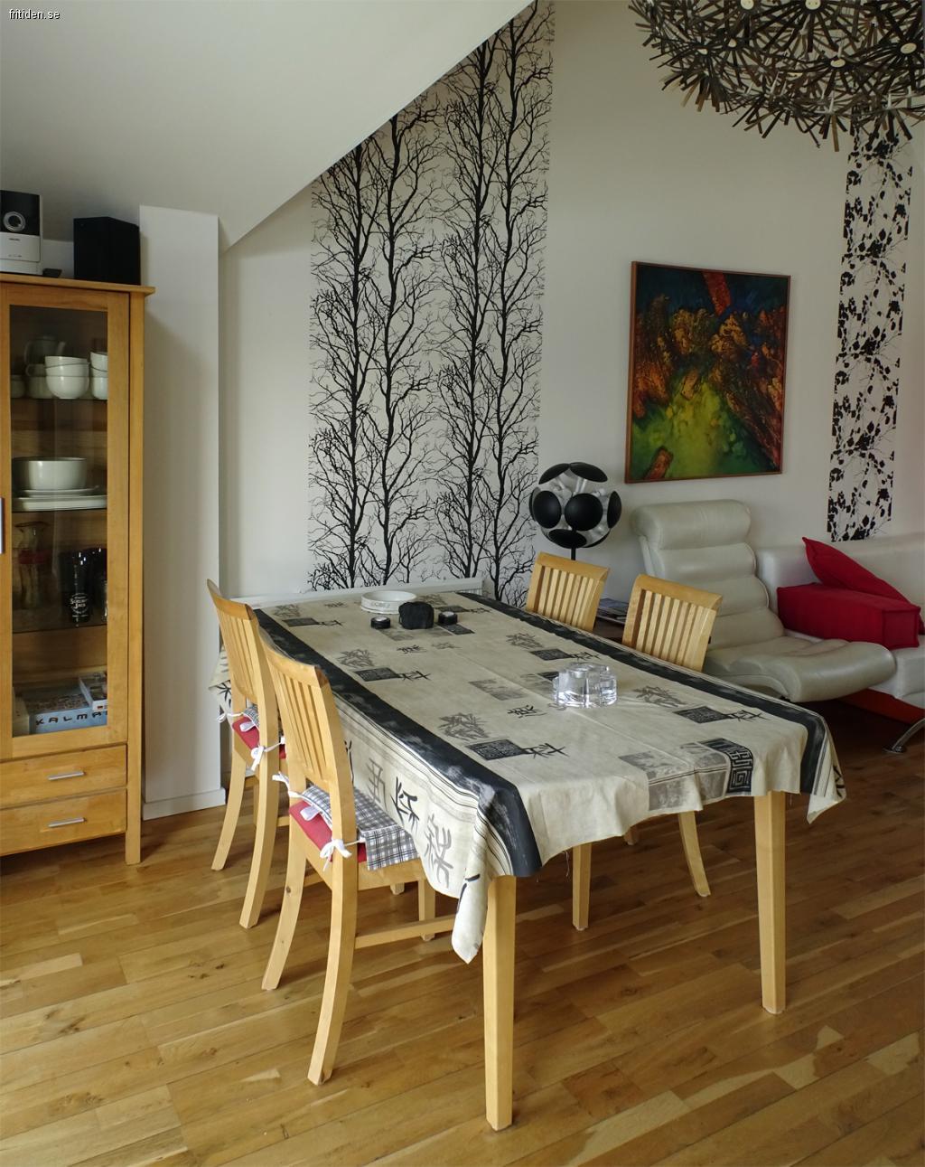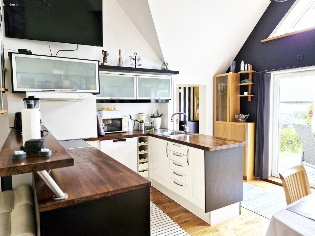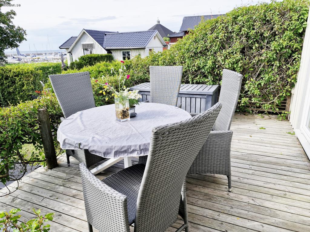 Övrigt; tvättmaskin/torktumlare, TV (bas Telia), AC och Wifi-anslutning. Terrassen i västerläge komplett med trädgårdsmöbler, dynbox, parasoll och grill.