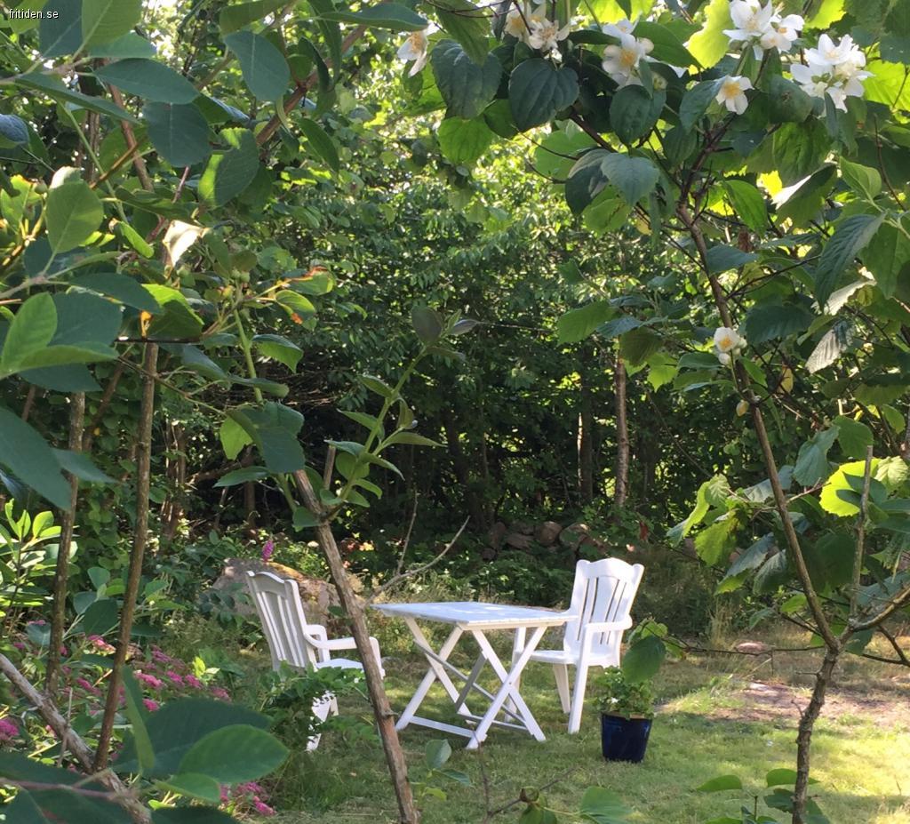Den stora naturtomten har ett fritt och ogenerat läge vackert inramad av en klassisk stengärdsgård. På delar av tomten är det trädgård med små gräsmattor med plats för utemöbler. I trädgården växer bland annat vildapel, syren, jasmin, fläder, kaprifol, liljor och rosor.