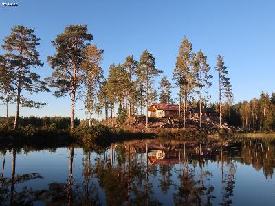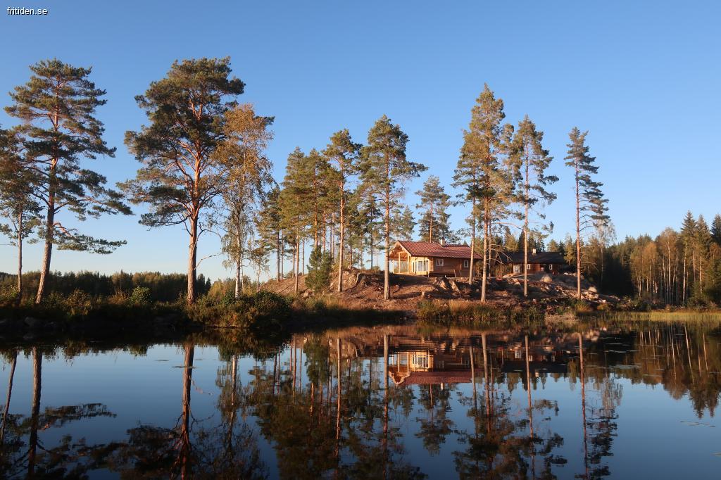 Timmerstuga placerade på udde i Helgesjön Skillingmark.