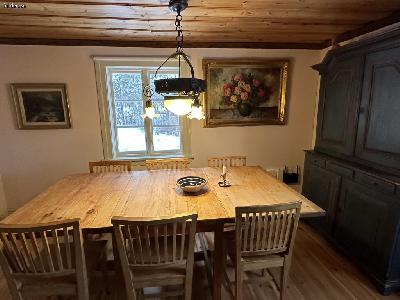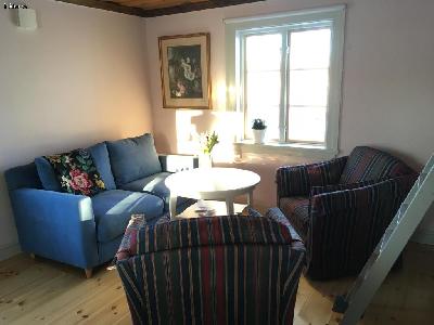 Vardagsrum med matbord, Dux-soffa, två fåtöljer samt våningssäng (två bäddar 200x90 cm med resårmadrasser av bra kvalitet + rejäla bäddmadrasser).