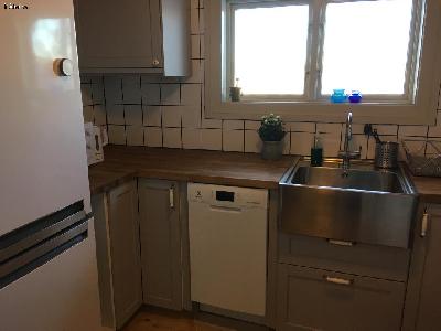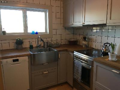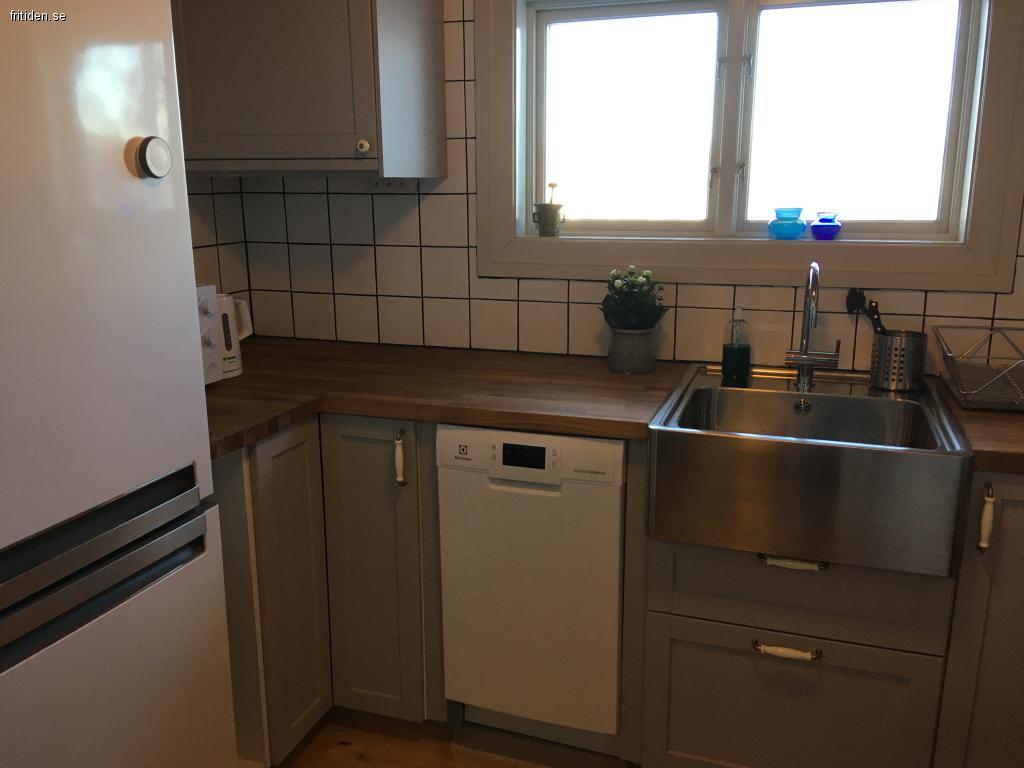 Fullt utrustat modernt kök med diskmaskin, ugn/grill, keramisk spis (glashäll) och mikrovågsugn. Bänkskivor i massiv ek.