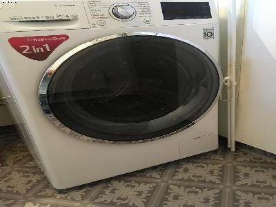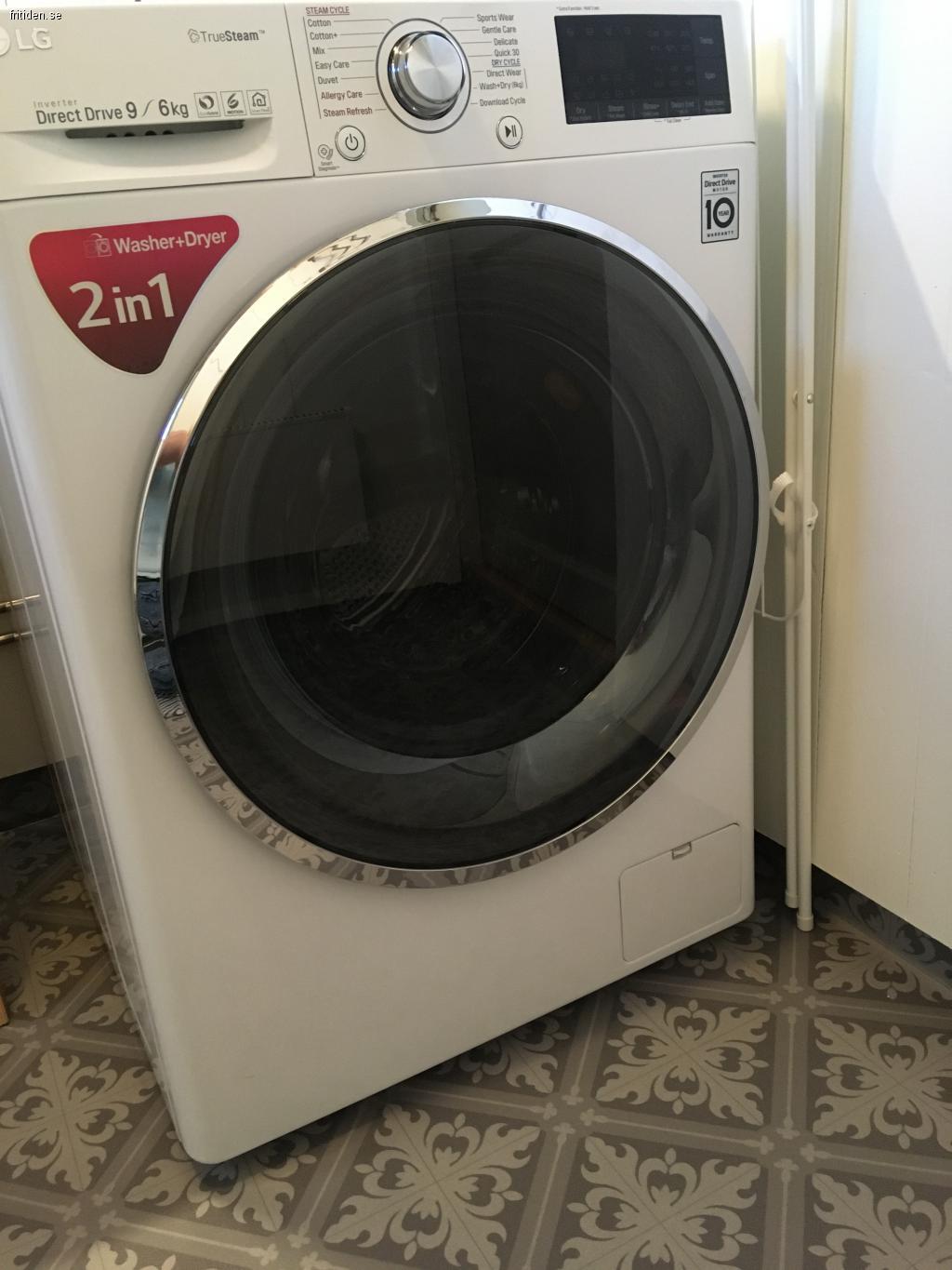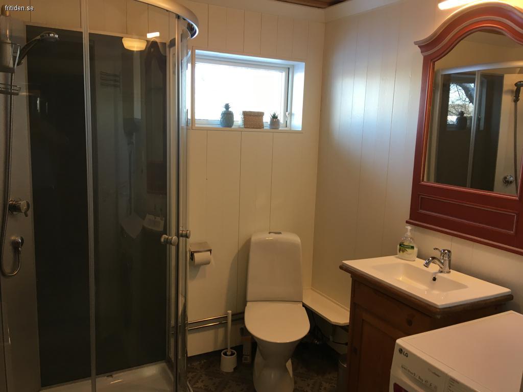 Badrummet har vattentoalett, duschkabin, handfat + tvättmaskin/torktumlare.