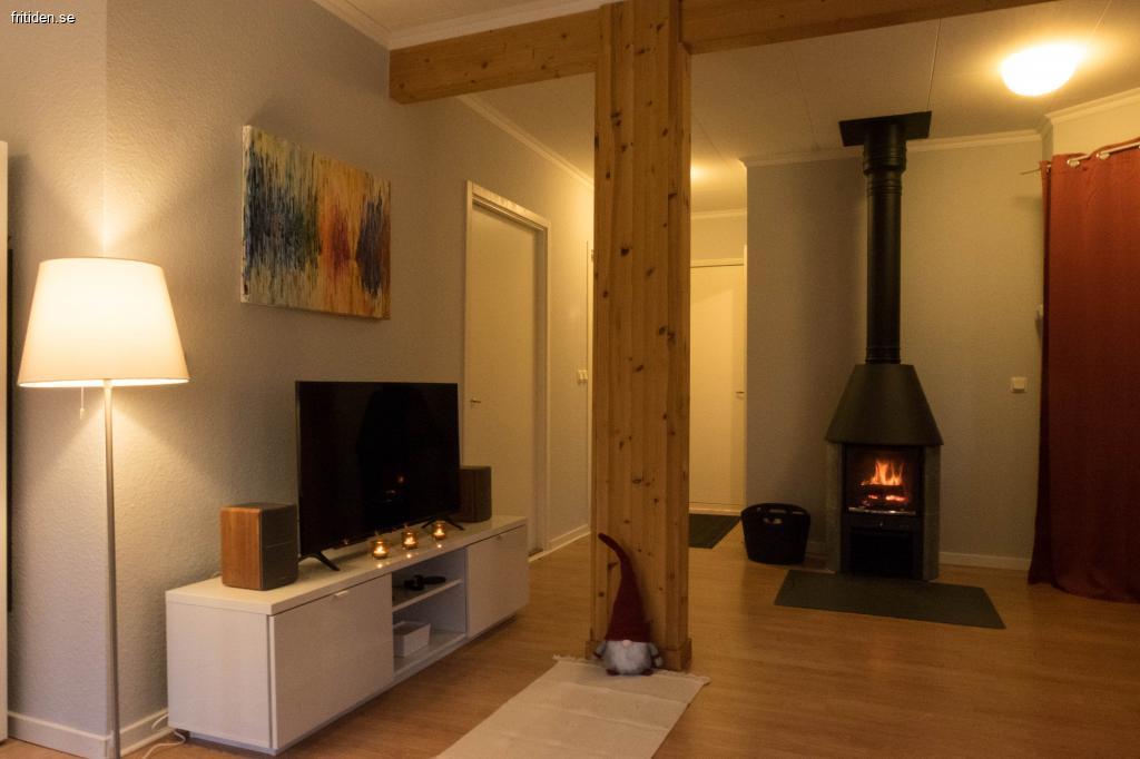Entré med liten hall. Intill hallen ligger det välutrustade köket med öppen planlösning mot matplatsen. Denna ligger öppen mot vardagsrummet med en centralt placerad eldstad synlig från både matplatsen och soffgruppen med TV. Därifrån finns utgång till solig altan för att ta en fin frukost