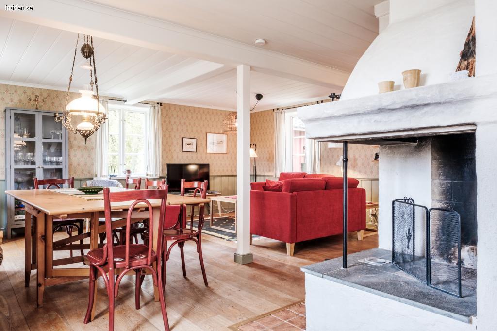 Entréplan med WC, allrum med kök, matplats, soffgrupp, öppen spis.