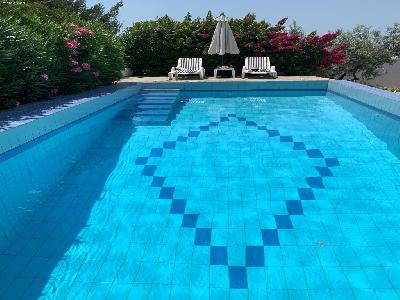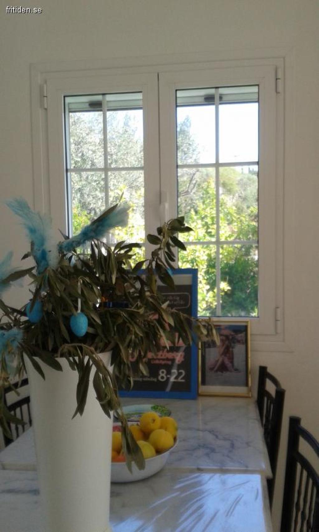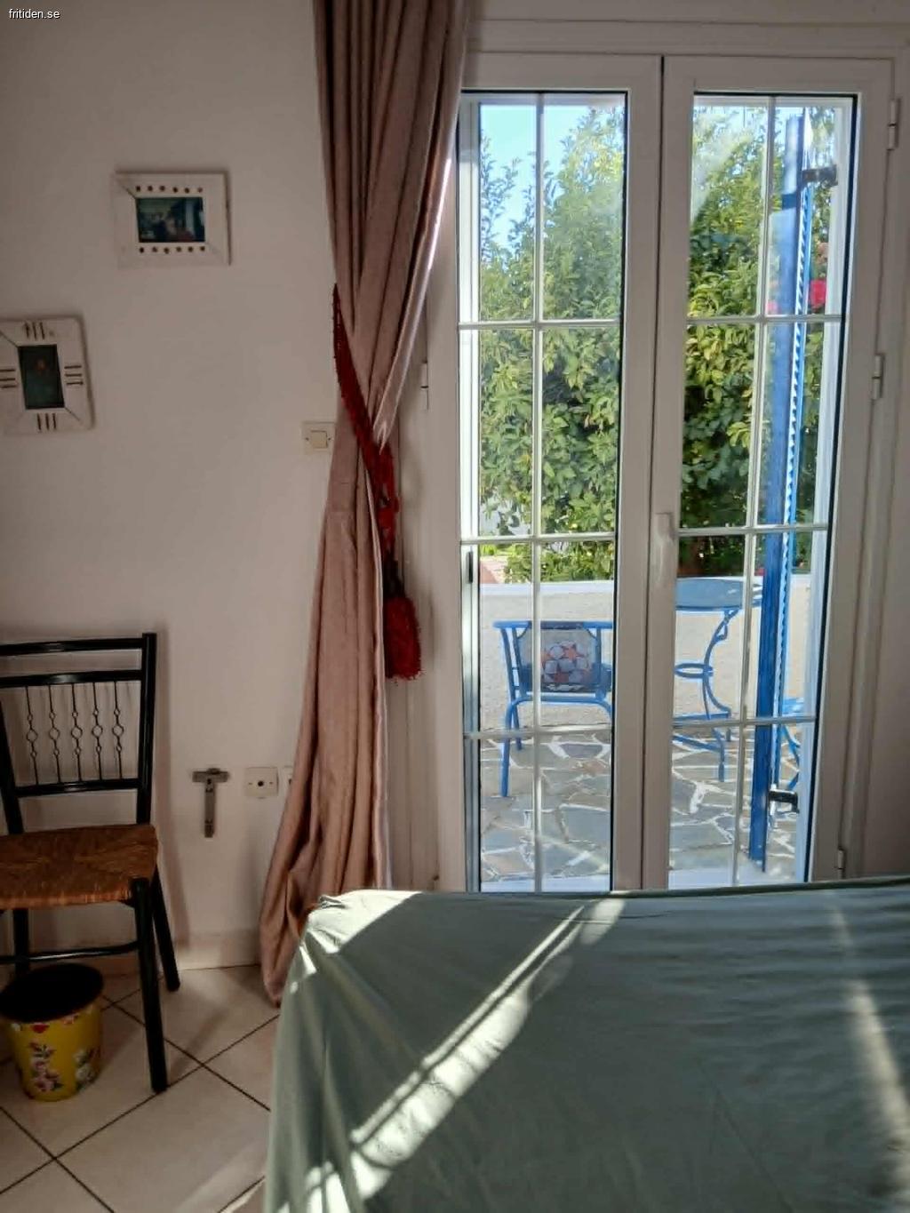 Magnifikt havspanorama från stor terrass 17 m2, på ön Aegina, 2,5 tim från Atens flygplats, 80 m till närmaste strand och badplats, privat pool, som är till enbart för husets gäster, stora glaspanorama dörrar mot havet ger magnifikt havs panorama från vardagsrum, kök och stor terrass, på 17m2, med en stor murad grill. Utsikten är förtrollande över Saroniska bukten mot öarna Agistri och Moni, i bakgrunden ser man Peleponnessos. Det är ett friliggande vitrappat hus med blåa fönster luckor, alla väggar är vitkalkade, alla fönster och alla dörrar är vita. Detta ger en mycket ljus miljö. Nedre plan består av hall, fyra sovrum och ett badrum. Master bedroom är störst, har dubbelsäng, glasdörrar mot trädgården och egen möblerad terrass utanför. De andra sovrummen är mindre och har två bäddar i varje rum. Badrummet har dusch, toalett och tvättmaskin. AC, väggfläktar och wifi finns i huset. En järnsmidd spiraltrappa leder upp till övre plan. Övre plan består av en öppen planlösning, med vardagsrum och kök, toalett och en stor terrass , 17 m2 i SV med en stor murad grill. Det finns matbord i marmor, matstolar, en soffa med schäslong med soffbord, smarttv, och en öppen spis. Köket är fullt maskinellt utrustat med hällspis, kyl/frys, mikro, diskmaskin, vatten- och kaffekokare.Stora panorama fönster ut till terrassen erbjuder en magnifik havsutsikt inifrån kök/vardagsrum. På baksidan finns en liten terrass och en spiraltrappa som leder upp till takterrassen. I trädgården finns en egen pool, med solvagnar på pooldäck, citron- och fikonträd, clementiner, jasminer, blyblomma, bouganvillea och kryddväxter. Det är ett lugnt område med få turister. Närmaste badplats ligger nedanför huset, ca 80 m, här badar vi och byborna, vattnet är fint. Här är perfekt för långa simturer och picknick. Här kan man ofta simma ensam. Huset ligger ca 3,5 km utanför Aegina stad, Det är ett lugnt område med få turister. Avstånd till restauranger, mataffär och barer är ca 500 m. Här finns också en större mer turistisk strand med solvagnar och parasoll. Här lever man utmärkt med cykel. Huset har egen parkeringsplats om man vill hyra bil. Det går flera bussar om dagen in till Aegina stad. Staden är mycket vacker med små gränder, bilfria gator,och en mycket vacker marina och strandpromenad. Fiskmarknad varje dag. Här kan man åka häst och vagn. Många små mysiga restauranger. .Det tar bara 40 minuter med snabbåt, Flying Dolphin att ta sig till ön Aegina från hamnen i Pireus. Flygbuss från flygplatsen till hamnen i Pireus tar ca 1 timme och 10 minuter. Hit kommer du för att njuta av lugn, tystnad, havet, fjärilar, blommor och simturer i både hav och pool. Vi välkomnar gärna gäster för att njuta under minst två veckor, hyran är för fyra personer. Det går bra att vara fler mot en extra kostnad. Vi hyr ut huset 1-14 juni,4-11juli, och 10 augusti-21 september. Vill du tala med någon som känner huset väl, går det bra.