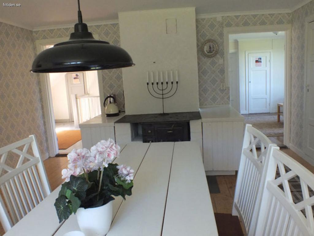 Stort lantligt kök med spis, kyl och frys, diskmaskin och sittplatser för 8 personer. Det finns också en vedkamin för mysiga vinterdagar.