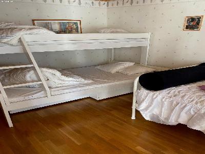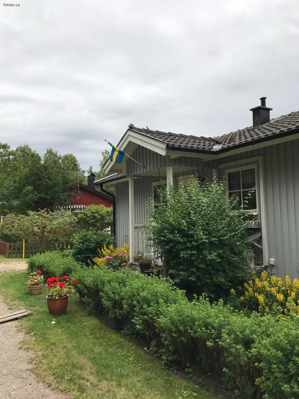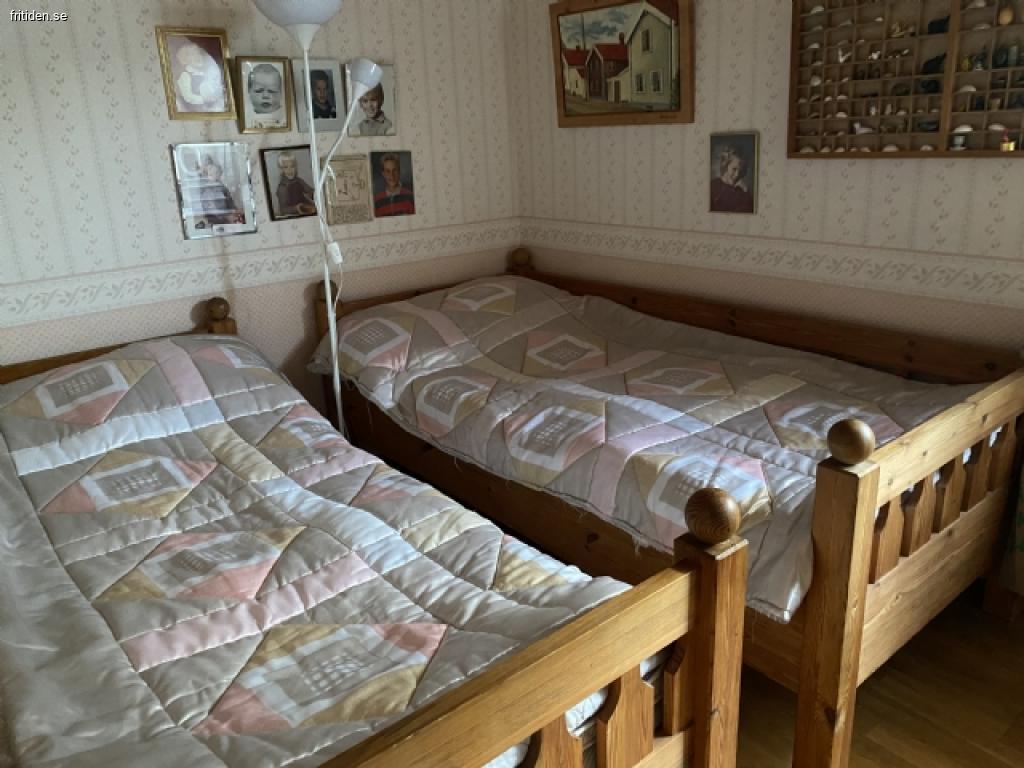 Fritidshus bestående av tre stugor. 250 m till bad. Lämpligt för två familjer. I storstugan finns två sovrum, det ena med dubbelsäng och det andra med två våningssängar. Helt nyrenoverat helkaklat duschrum. Kök med ny diskmaskin, mikrougn, kyl, frys. Köksmaskiner såsom elvisp, brödrost, vattenkokare och förstås kaffebryggare. I vidbyggnaden finns ett dubbelrum, litet kök med trinett, där det också finns två extra sovplatser, dusch, toalett och tvättmaskin. Här finns också kaffebryggare och vattenkokare. Ytterligare en gäststuga med två våningssängar. Dessutom finns 2 spjälsängar + resesäng med sängkläder och barnkuddar. Skötbord och tre barnmatstolar. Massvis med leksaker. Sällskapsspel för utomhus och inomhus för hela familjen. Dubbla kök, dusch och toaletter. Trevligt stugområde med många aktiviteter för barnfamilj.. TV/video, dvd, kyl, frys, diskmaskin, mikro, tvättmaskin, nybyggd, helt inglasad veranda med plats för upp till 20 personer runt bordet, insynsskyddad trädgård, lugnt läge utan trafik.