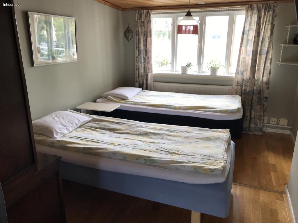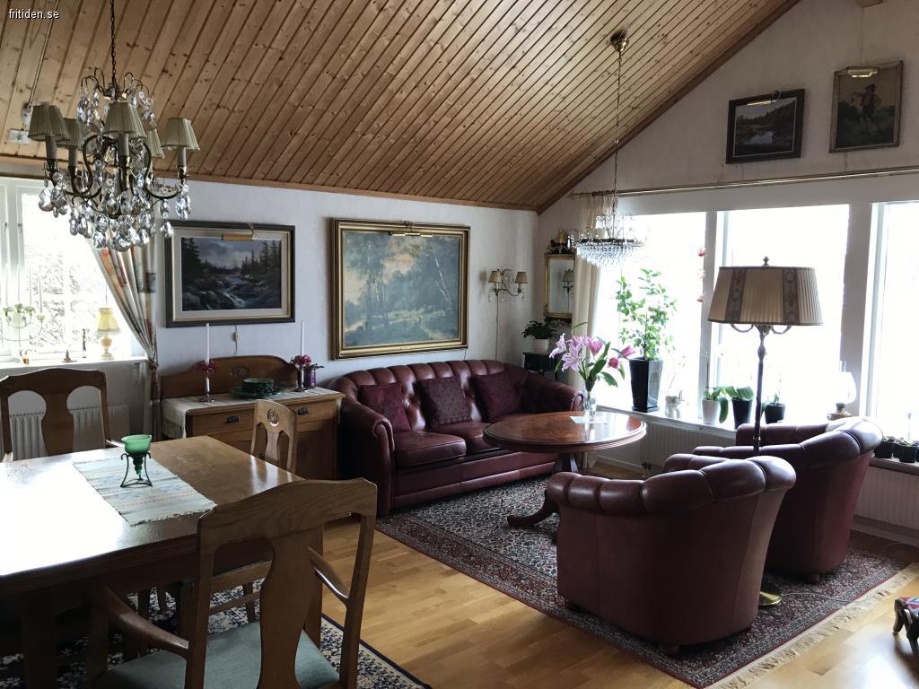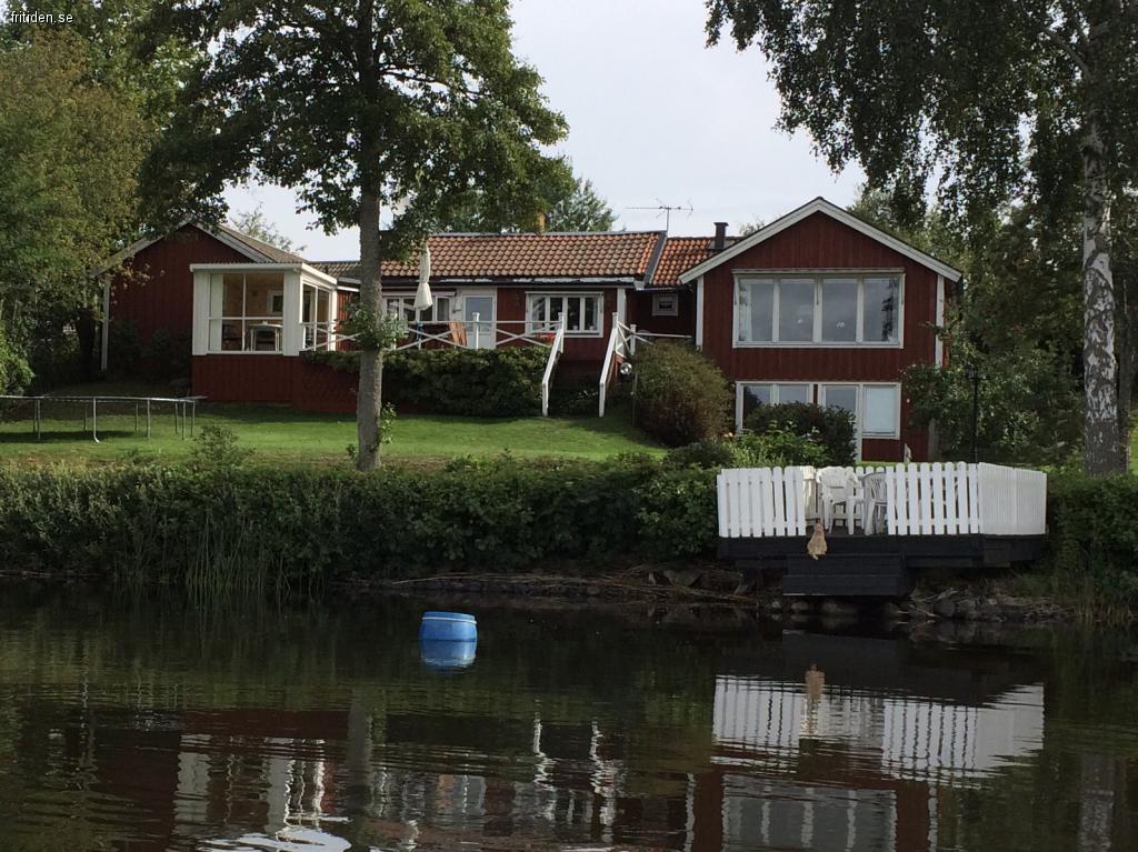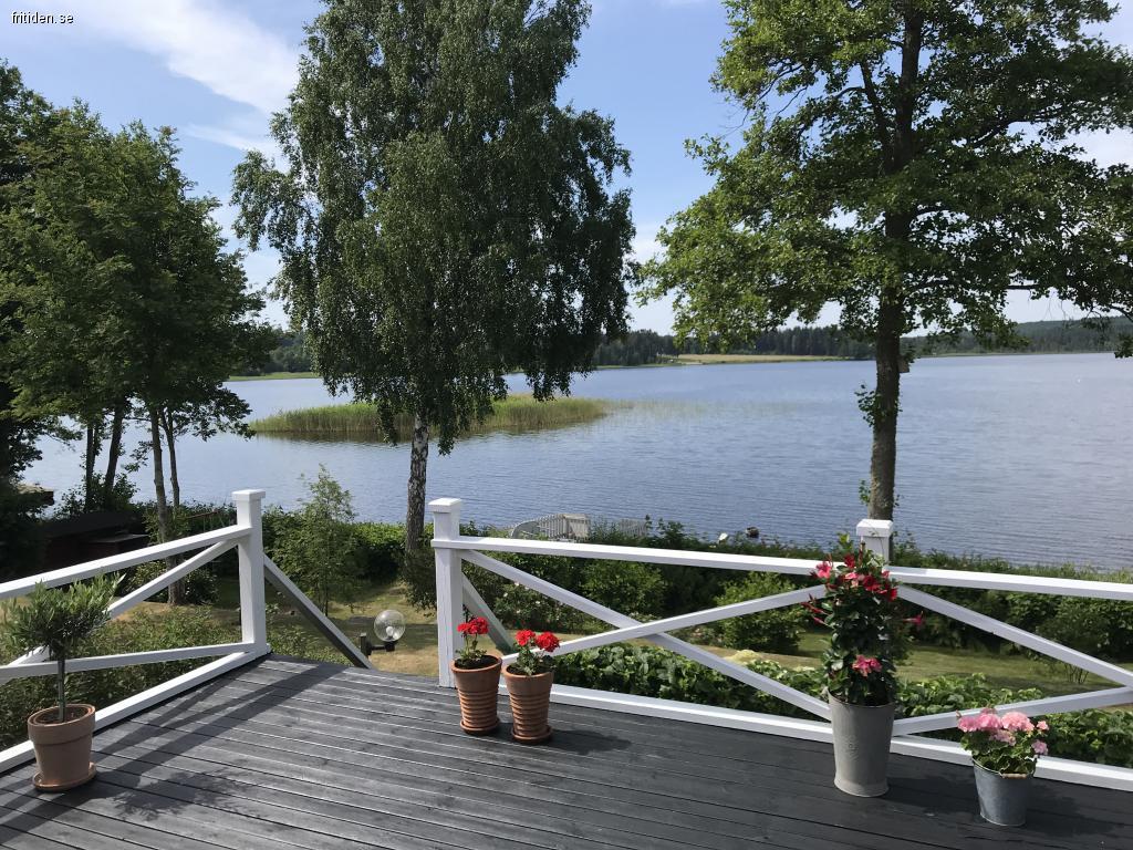 Uthyres: Hyra: 7900 kr/vecka! Stor inhägnad trädgård med tre utemöbelsittgrupper, egen brygga, roddbåt med motor. Stor veranda med gasolgrill. Kök, ett sovrum med dubbelsäng och en sovalkov med plats för två bäddar i anslutning till TV-rum, vardagsrum, två separata toaletter med dusch, bastu med inglasat uterum och utsikt över sjön, öppen spis, wi-fi.