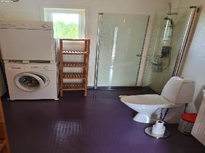 Stugan har ett fräscht badrum med dusch, toalett, handfat, tvättmaskin, torktumlare och bastu. Separat toalett med handfat.