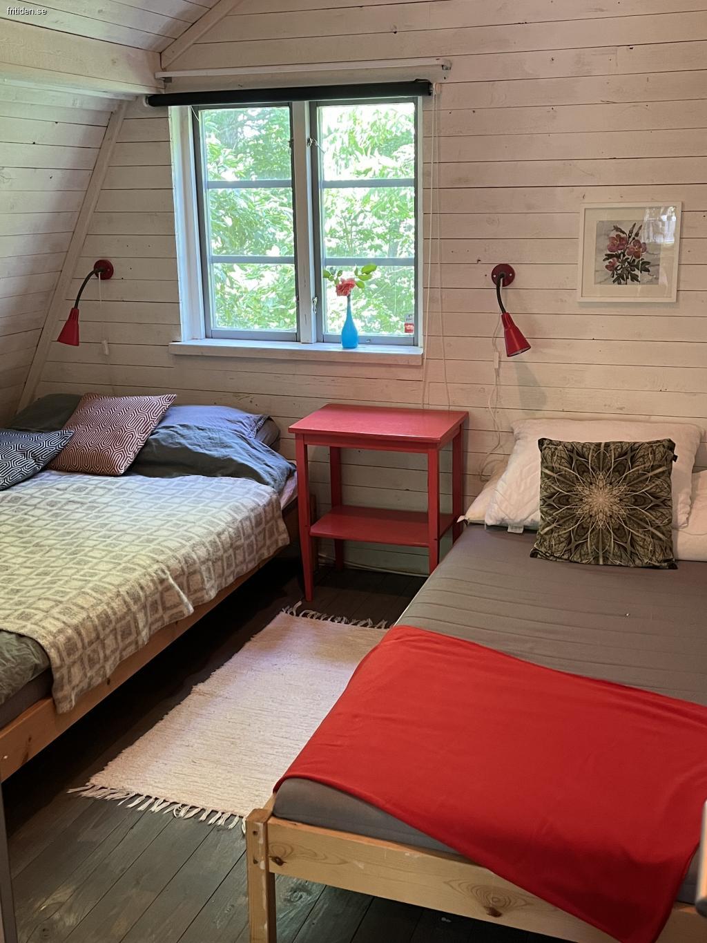 Kök med allrum och 2 sovrum. I köket har ni stor matplats och två soffor med TV. Ett sovrum har dubbelsäng samt enkelsäng. Det andra sovrummet har våningssäng samt enkelsäng. Möjlighet finns att sätta in extrasäng. Lakan och handduk kan hyras för 100 kr/person. Tvättmaskin finns. Badrum med WC/dusch.